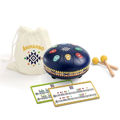 Trommen har 8 toner, og du slår på metal-tungerne med tommestikker med gummi-hoved. Hver tunge/tone har sin egen farve og nummer, så det er nemt at spille efter de medfølgende noder. Trommen står på tre fødder gummi, så der kommer den rigtige resonans.