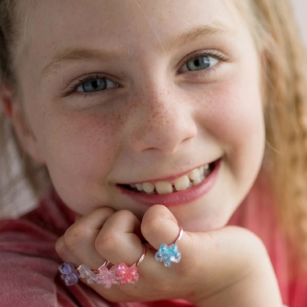 Ringene har en fin lille blomst med glimmereffekt og kan justeret lille i ringstørrelsen - og så er der 5 forskellige farver at vælge imellem - så skal hele hånden pyntes eller hvilken farve mon det skal være i dag?