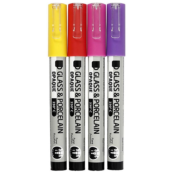 Fire lækre tuscher i farverne gul, orange, lilla og lys rød til at male på glas og porcelæn med. Stregtykkelsen er 1 - 2 mm.