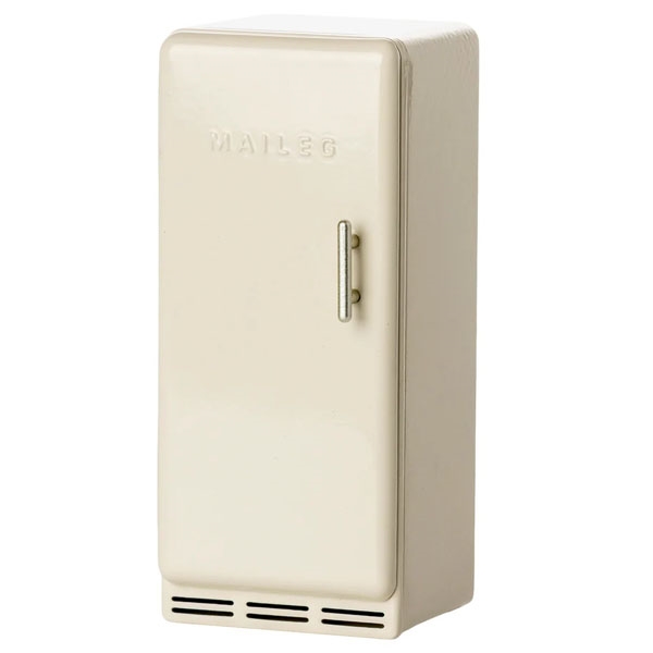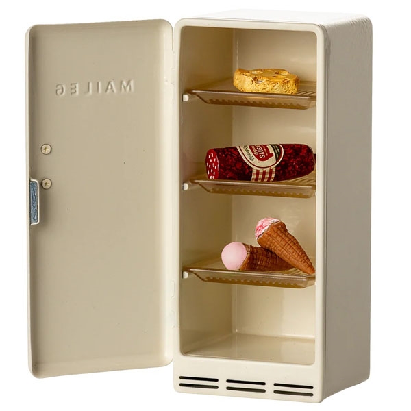 Skabet er fremstillet i emaljeret metal og der følger miniaturemad med: ost, pølse og isvafler.