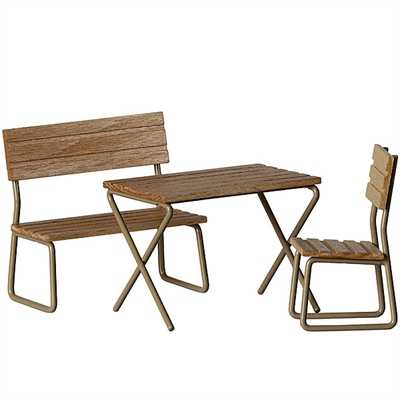 Sættet består af et bord, en stol samt en bænk og er lavet af træ og metal.