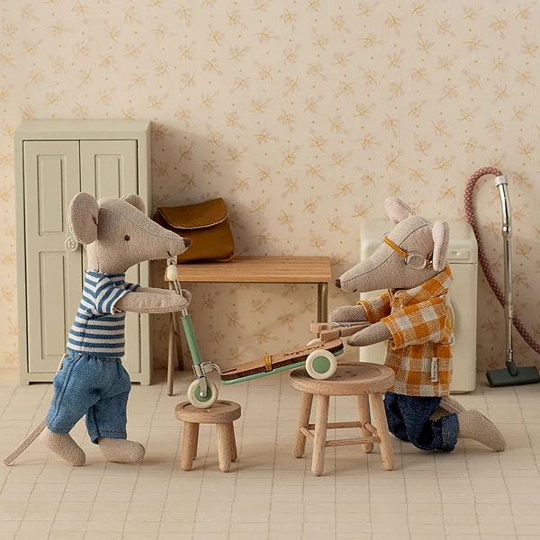 Storebror mus har fået et flot løbeshjul. Men først skal han lige undersøge det lidt nærmere sammen med sin far.