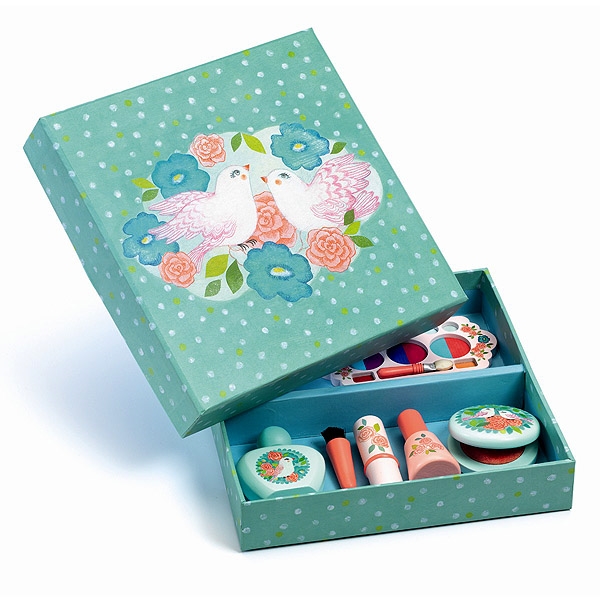Den flotte æske indeholder læbestift, parfume-flaske, øjenskygge, rouge og pudder - alt sammen i træ.