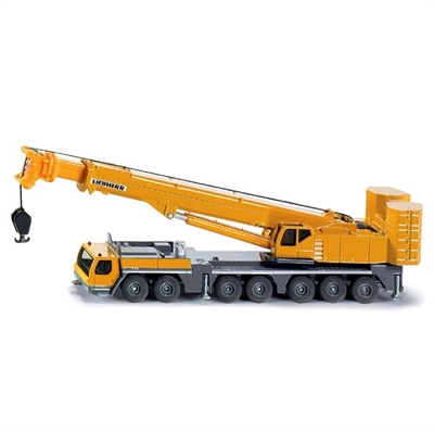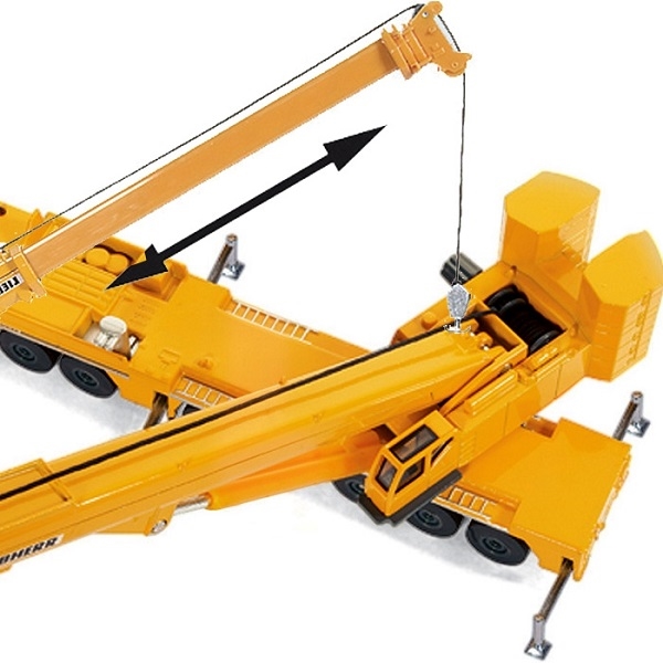 En lille Liebherr mobilkran, der kan meget. Køretøjet er udført i metal med smådele af PVC fri plastic. Førerhuset kan drejes 360 grader rundt, teleskop armen kan hæves og sænkes og armen kan forlænges til næsten dobbelt længde og endelig kan man med en skrue på siden styre snoretrækket til krogen. Mobilkranen har yderligere metalfødder, der kan trækkes ud, så den kan stå helt stabilt, mens der arbejdes med den imponerende kran. Mål på æsken: 97 X 255 X 66