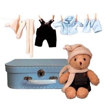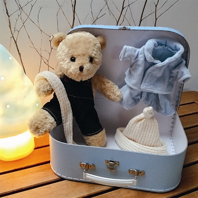 Sættet består af bamsen Morris, hans kuffert og tøj: praktiske smæk-bukser i denim, strikket hue og halstørklæde samt jakke og bukser i lyseblå velour.