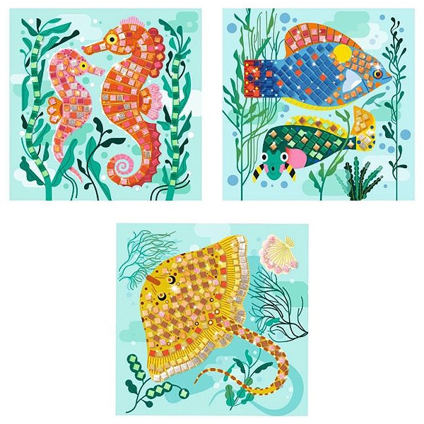 Lav-selv mosaik plader med spændende motiver af havets dyr. Sættet indeholder 4 plader, og skinnende skumfirkanter der kan klæbes på farvekoderne på pladerne.
