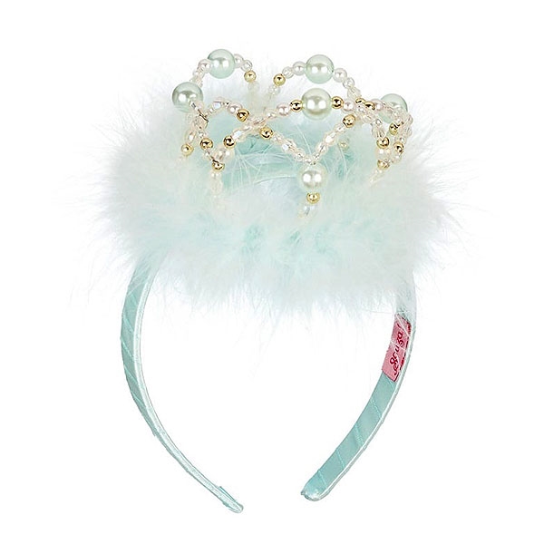Kronen er dekoreret med hvide, gyldne og turkise perler. Endvidere er der en krans af turkis "svanedun".