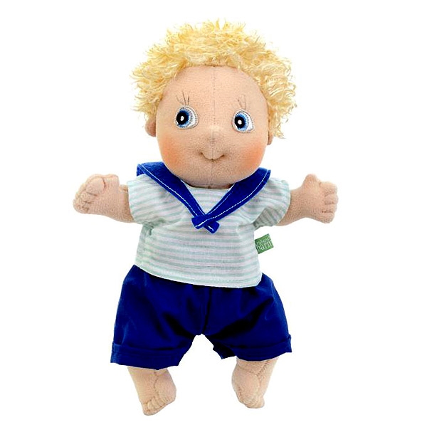 Søde Adam er en dejlig blød stofdukke med lyst krøllet hår.