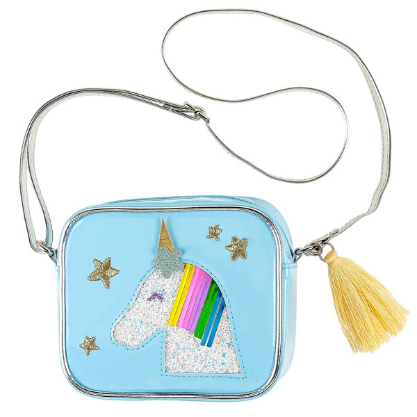 Enhjørningen er hvid med glimmer, gyldent horn og regnbue farvet manke. Skulderremmen er sølvfarvet.