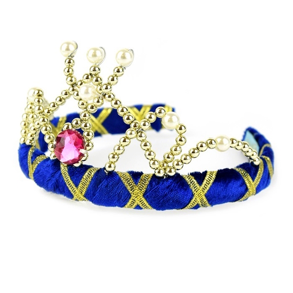 Denne Tiara er beklædt med blåt velourstof med guldbånd og pyntet på bedste vis med perler og en flot "ædelsten".