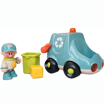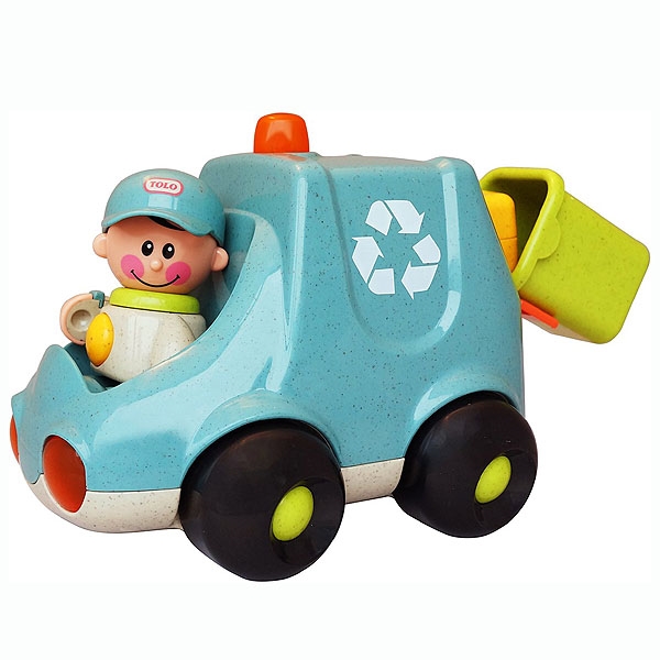 Skraldemanden har arme og ben der kan bevæges mens det klikker og hans kasket kan drejes. Trykkes han på maven kommer der en pivlyd.